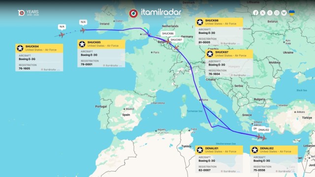 The United States is also moving additional assets - not just Fighter Jets - toward the Gulf. In these hours, we are tracking the largest movement of USAF AWACS aircraft we have ever recorded. Map Below:
