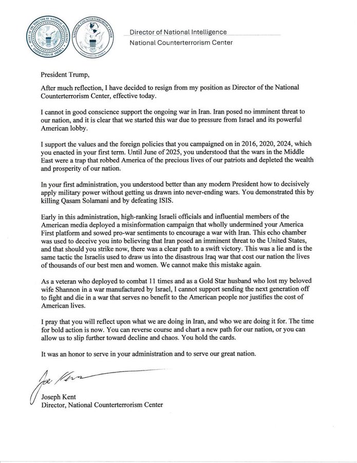 Joe Kent, the Director of the United States National Counter-Terrorism Center, resigned today over the Iran war.