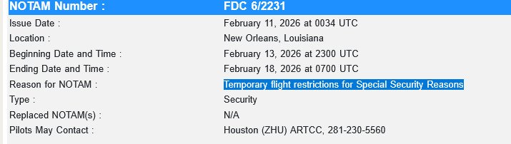 This second closure could be related to Mardi Gras, which is on February 17, but why five days air space closure?