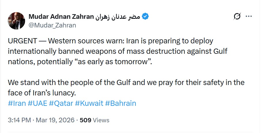 "URGENT — Western sources warn: Iran is preparing to deploy internationally banned weapons of mass destruction against Gulf nations, potentially “as early as tomorrow”.