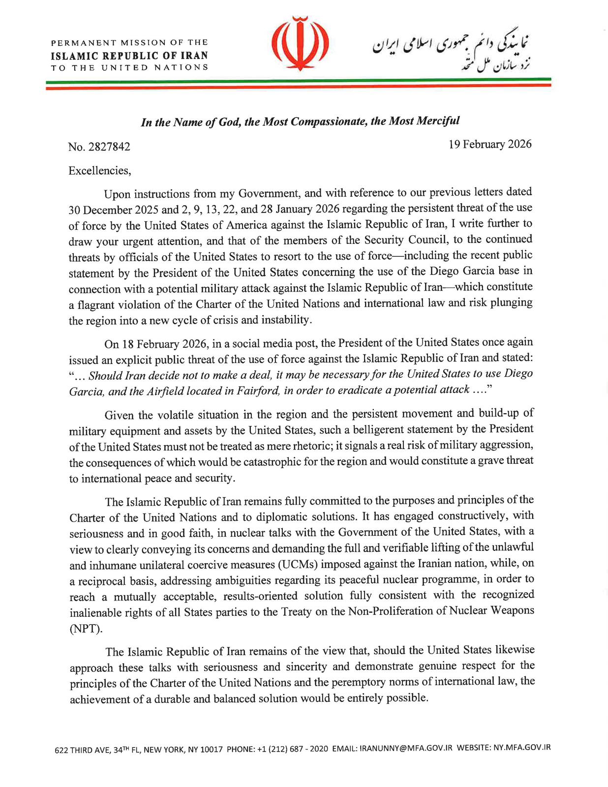 Iran, in a letter to UN Secretary General: "If attacked, all bases, facilities, and assets of the hostile force in the region would constitute legitimate targets in the context of Iran’s defensive response.