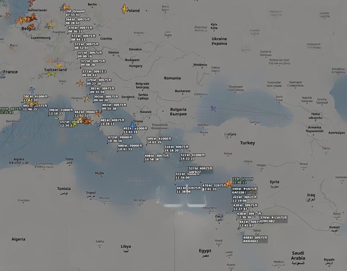 This is the publicly available FlightRadar24 / ADSB aircraft tracking website from yesterday, showing an air convoy of Eurofighter Jets flying from Europe to Cyprus as part of the massive buildup: