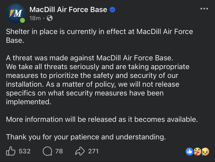 Shelter-in-place has been ordered due to a threat made against MacDill Air Force Base in Tampa, Florida, which houses the Headquarters of U.S. Central Command (CENTCOM).
