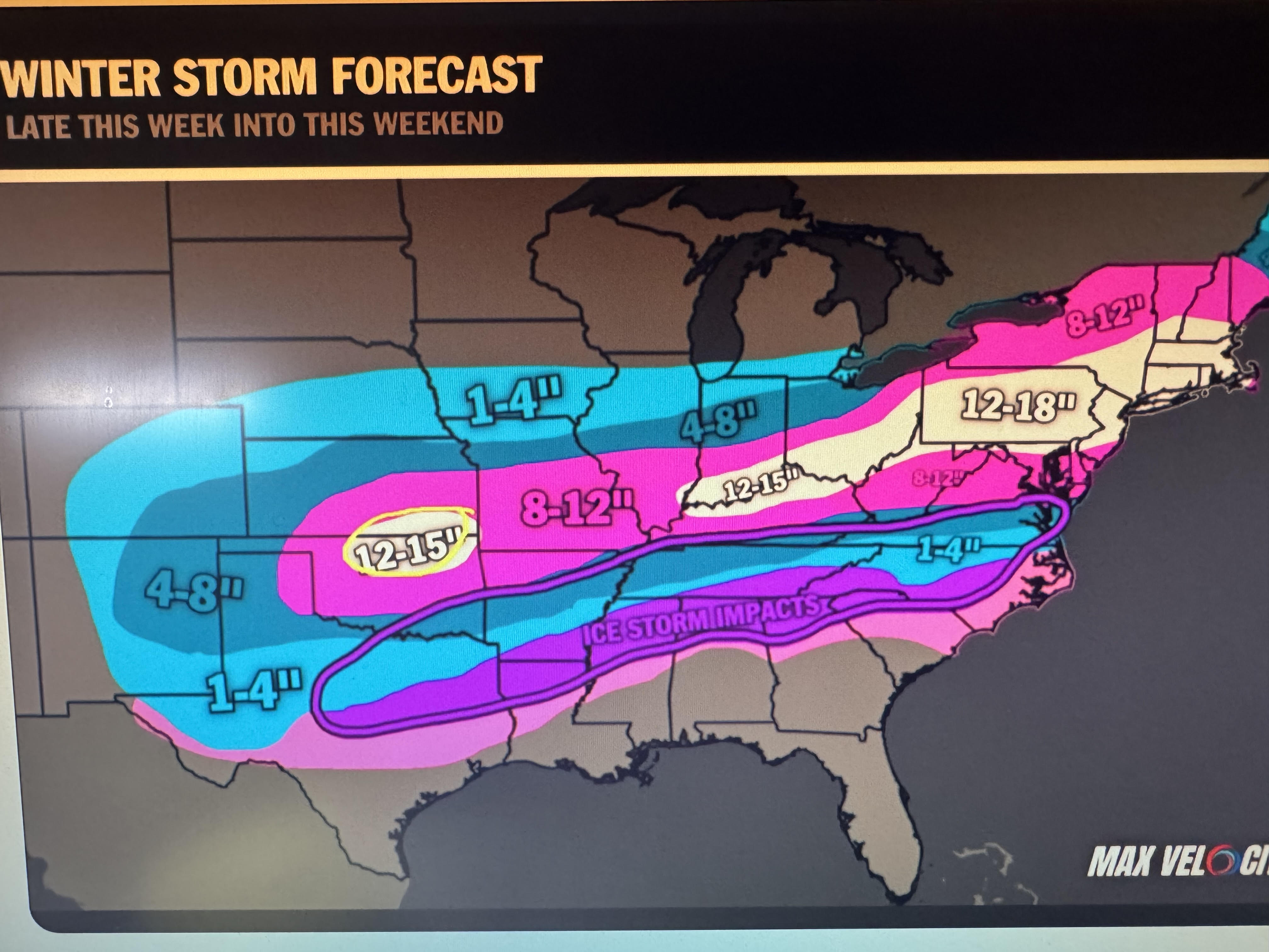 While this terribly cold air has been wafting into the country, a storm system formed in the South, as forecast. It is now developed in Texas, and on the move eastward, then northeastward dumping rain, ice and heavy snow: