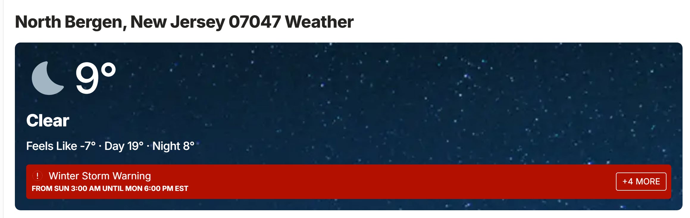Brutal Arctic Cold has reached northeastern New Jersey and New York City this morning, as I awoke to a temperature outside of nine (9) Degrees Fahrenheit, and Wind Chill making it feel like -7° .