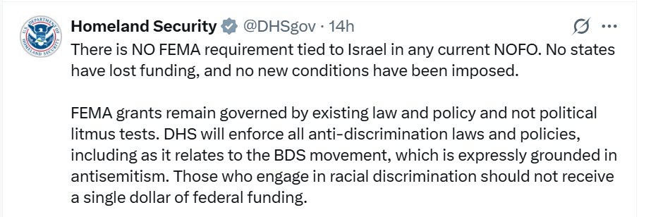▪ The policy extends further, also covering $553 million in federal counter-terrorism grants. Any jurisdiction that refuses the anti-boycott clause will be denied the funding, regardless of its emergency or security needs.
