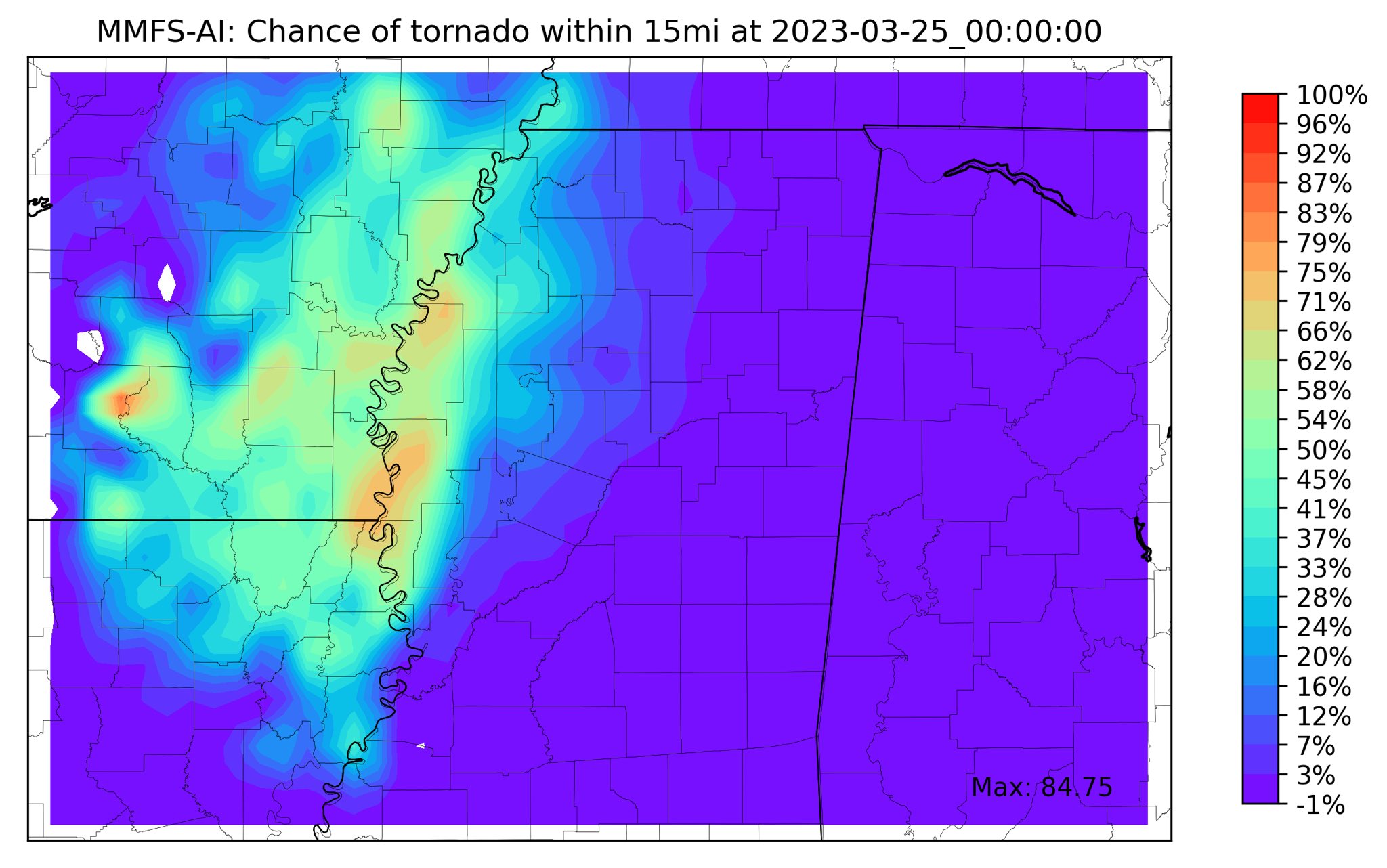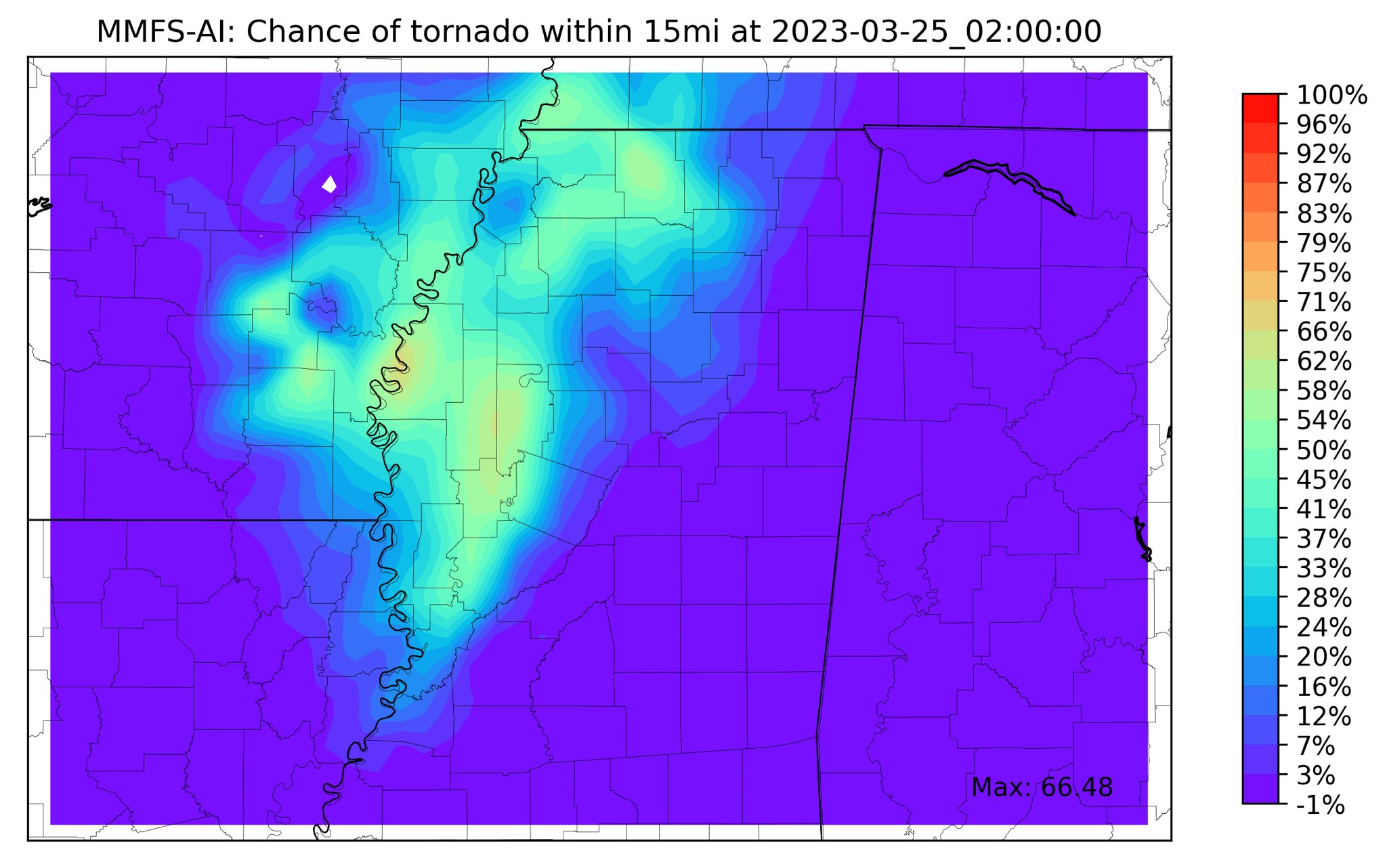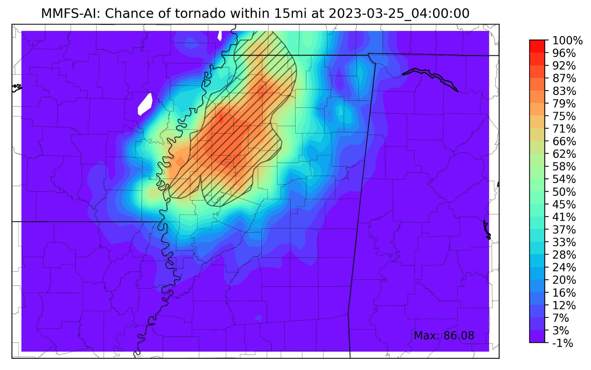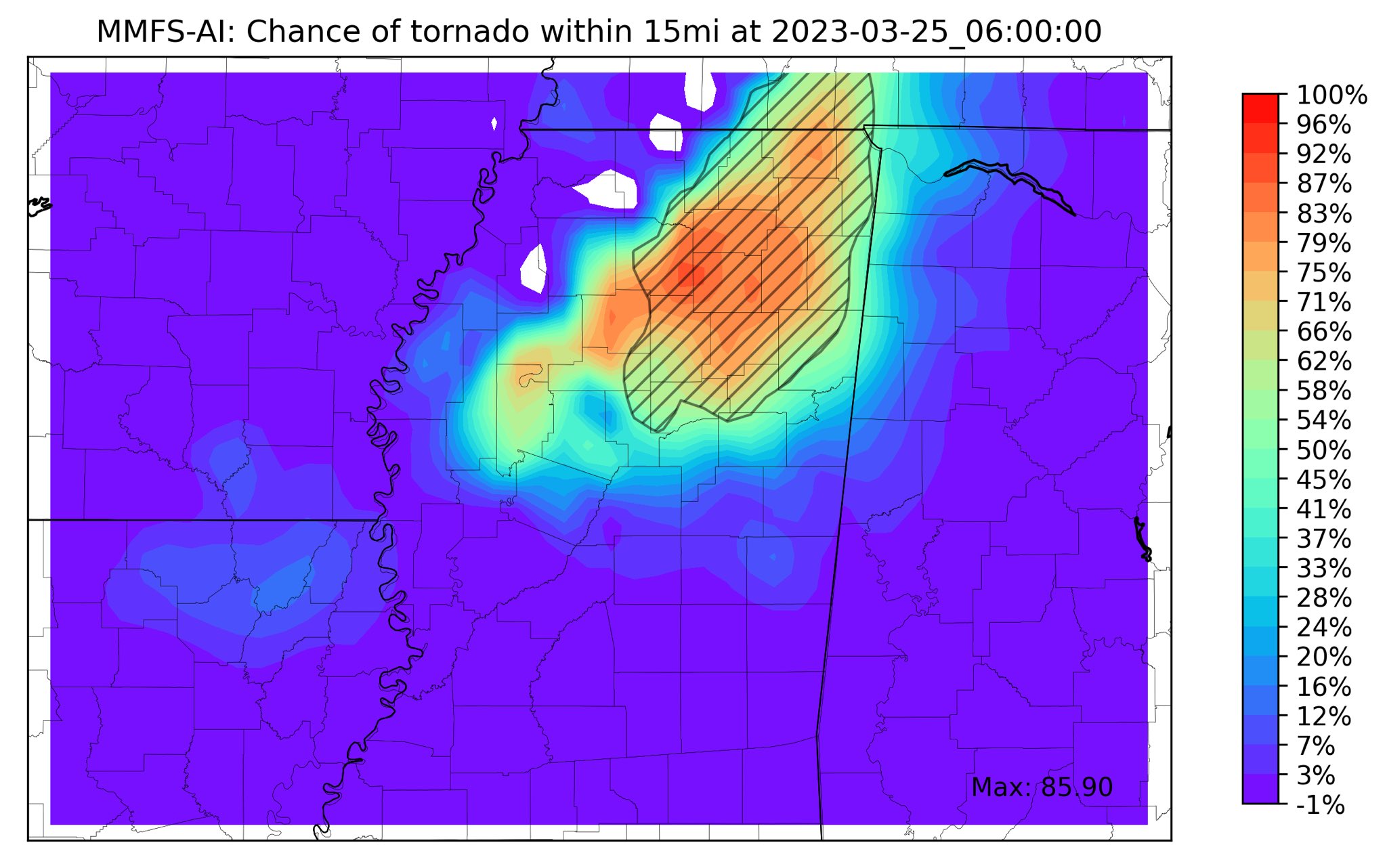 Experimental MMFS-AI deep learning tornado model for Friday night’s severe threat appears below. Absolutely hammers northern/central Mississippi and has been very consistent. Hatched is "sig tor." meaning "Significant Tornados."