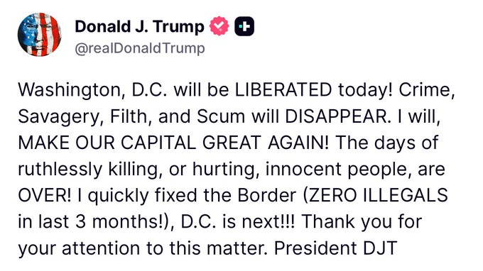 Rampant crime, widespread violence, raging drug sales and use, have dragged our nation's Capital into shameful degeneracy. All that ends, today. President Trump is sending federal agents, and perhaps federal troops to clean up the city of Washington, DC.