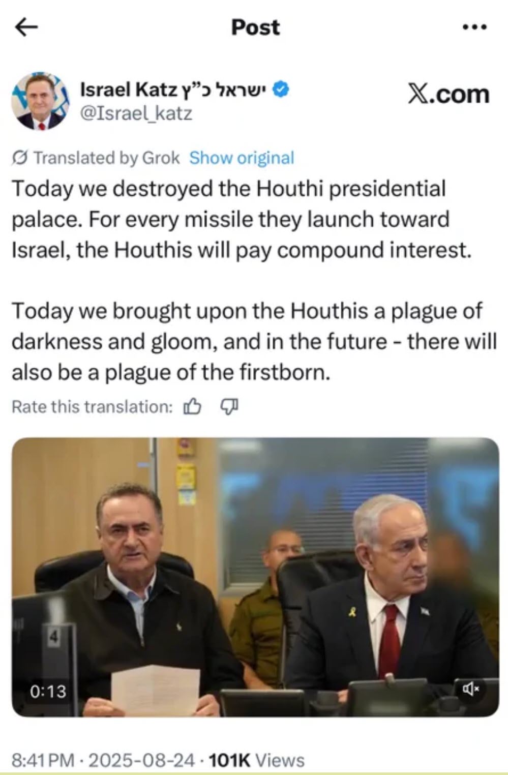 Israeli Defense Minister Katz issued a stunning threat to the country of Yemen: "Today we brought upon the Houthis a plague of darkness and gloom - there will also be a plague of the first born."