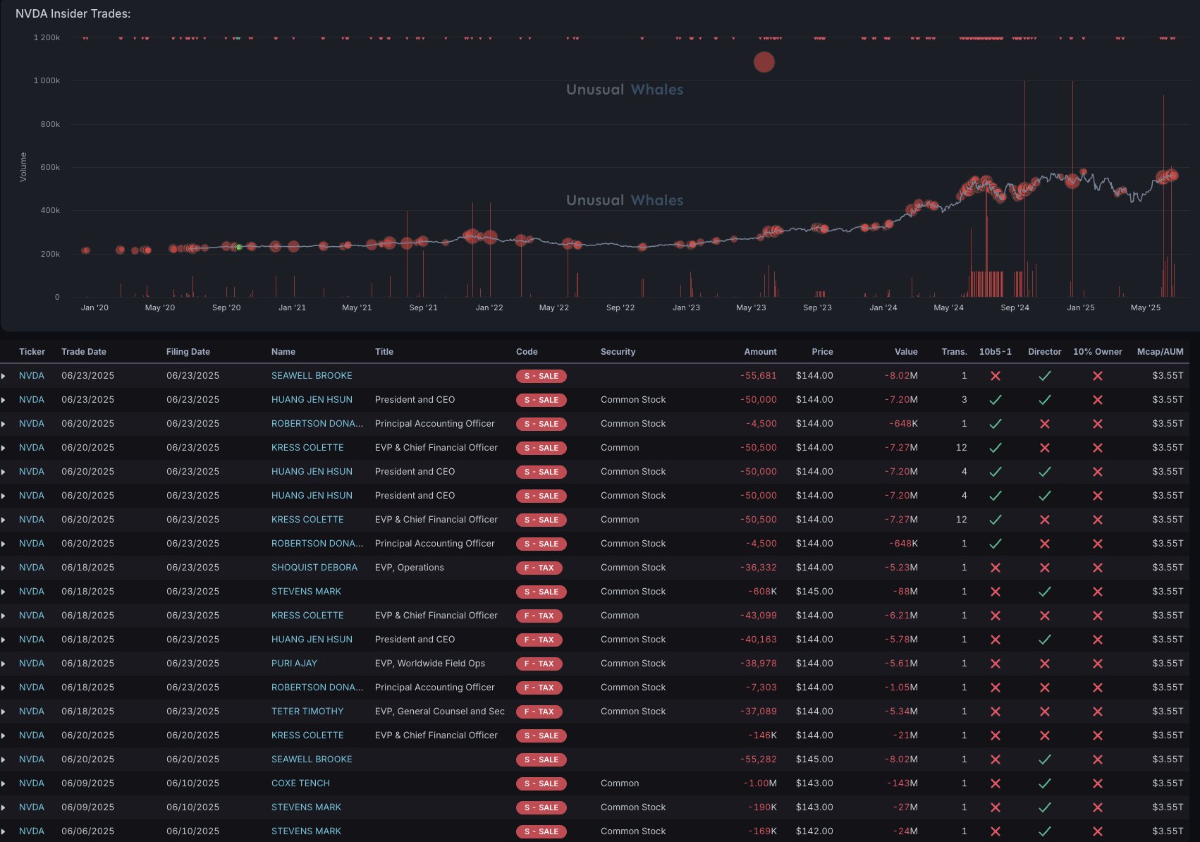 In the last month, Nvidia CEO Jensen Huang has sold over $200M in stock across 14 transactions of ~$15M each!