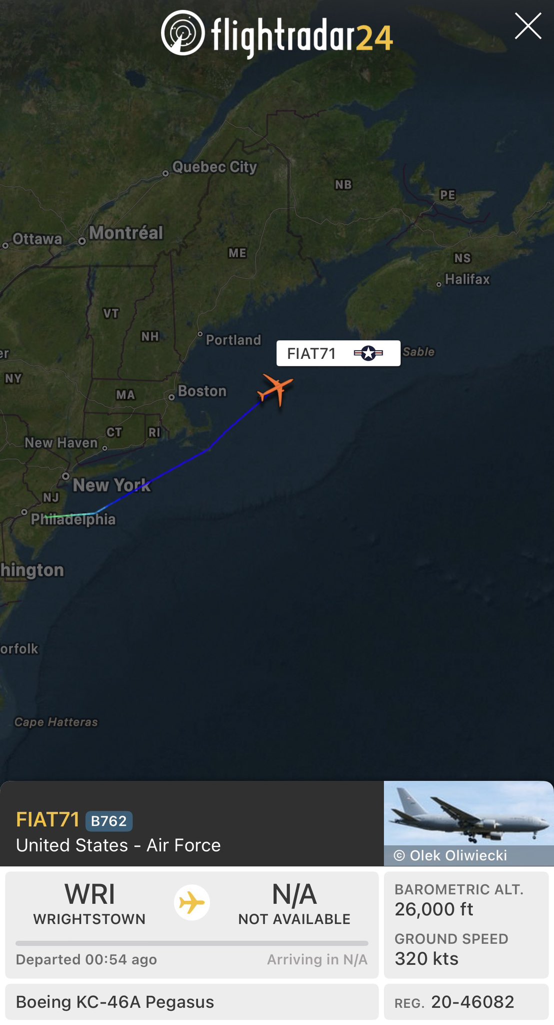 The B-2 Stealth are flying with Transponders OFF, using radio CALL SIGNS "ZOLAR 11 & 12" (B-2A Stealth Bomber) are refueling with "FIAT 71" (KC-46) on the AR20NE track over Nova Scotia.