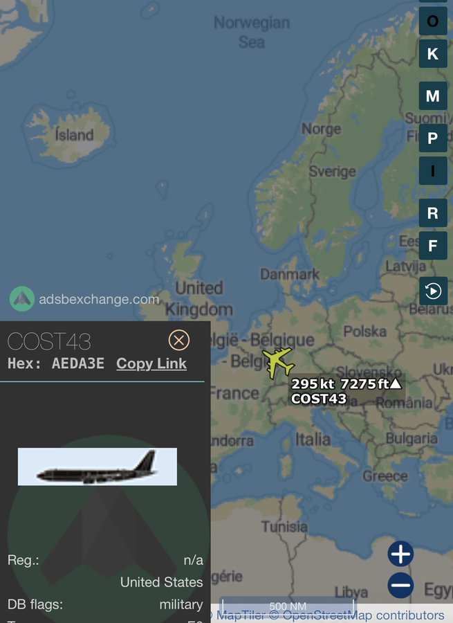 COST43 (E-6B TACAMO) is airborne off Ramstein Air Base, Germany for their altitude reservation off the coast of Iceland.