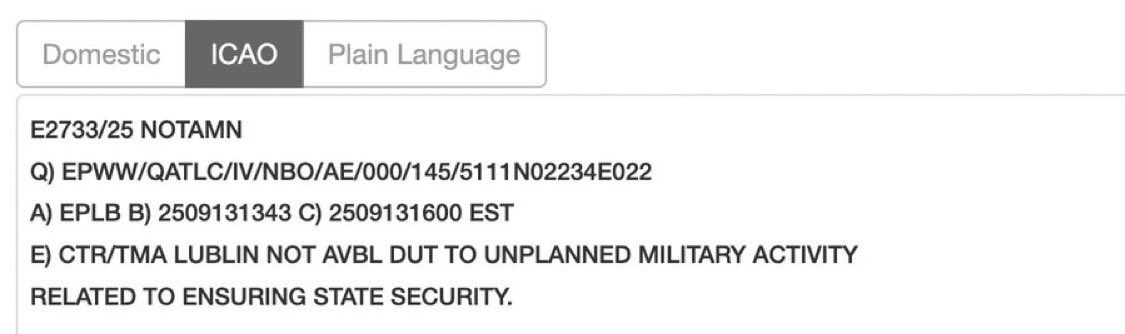 Lublin airport bear the Belarus Border has been CLOSED due to "unplanned military activity for national security. Here is the Notice-To-Airmen (NOTAM):