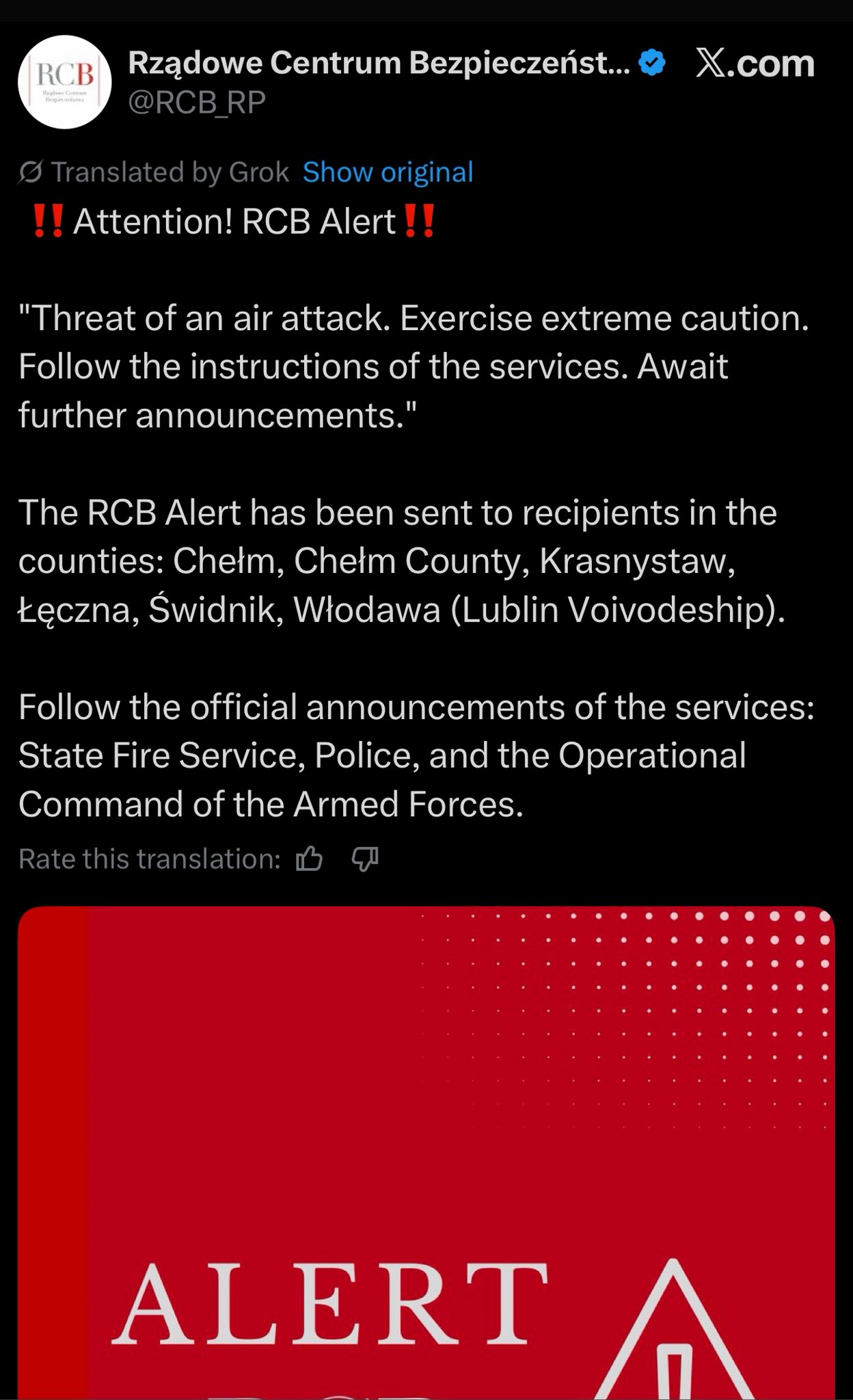 Emergency alert sent to Polish citizens in Lublin Voivodeship, bordering Ukraine and Belarus, warning of a threat of an air attack: