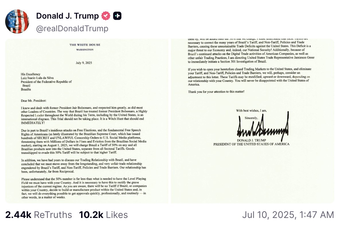 Trump's letter, imposing tariffs, mentions Brazil's Court over-reach: