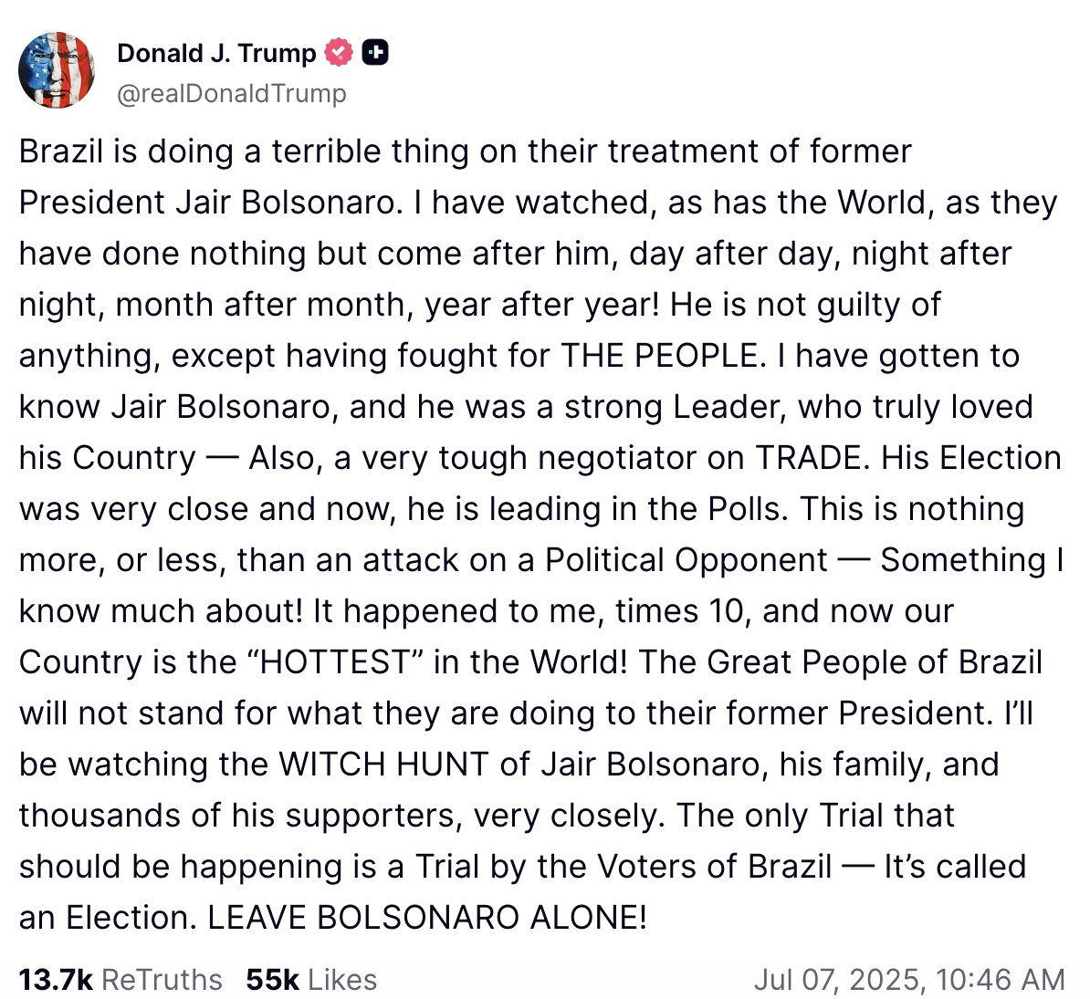 Apparently, Lula Da Silva is referring to a social media posting by President Trump: