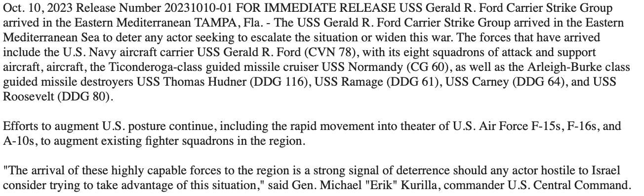 The Israeli Defense Force stated today that the United States has Advised them that U.S. Naval Vessels and Aircraft from Carrier Strike Group 12 which will soon be in the Eastern Mediterranean are prepared to assist with Combat Operations alongside Israel if a Multifront War against Hezbollah or other Regional Actors occurs.