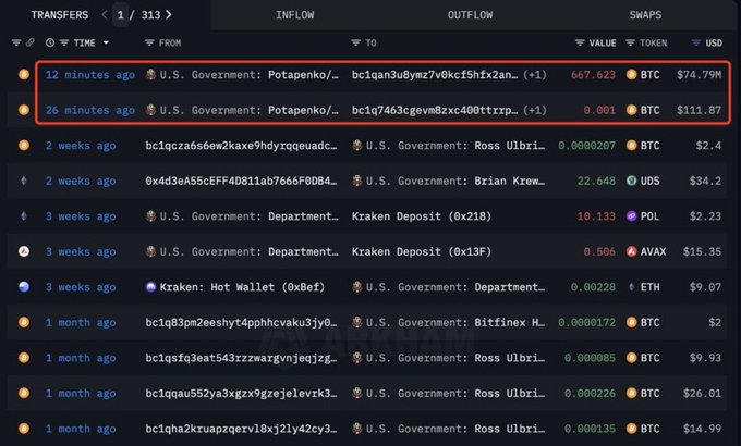 Then, minutes ago, the U.S. government shifted 667.6 BTC - roughly $74.7 million - from a seized assets wallet to a fresh address.