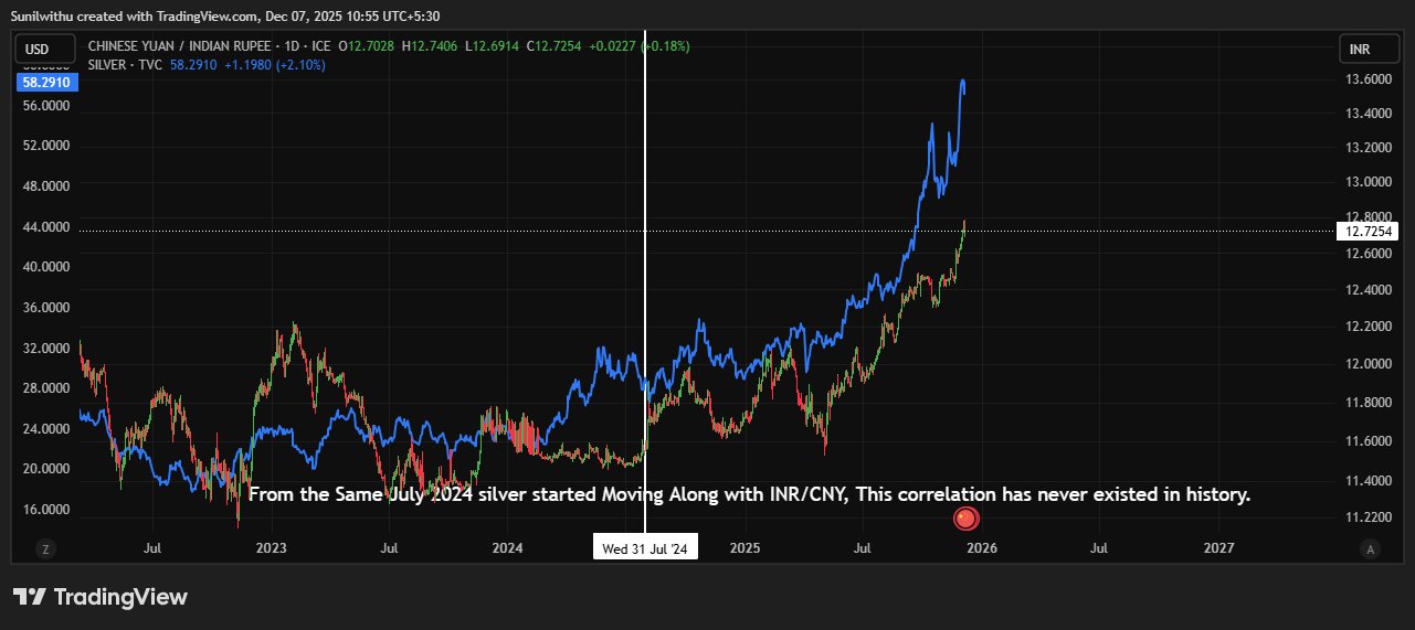 From July 2024, something shocking appeared on the charts: Silver began moving tick-for-tick with the INR/CNY exchange rate.