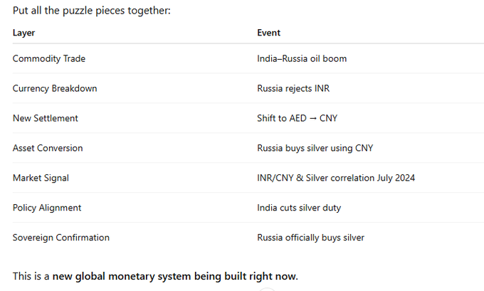 India buys oil → pays Russia in AED. Russia converts AED → CNY. China wants AED for Gulf oil. Russia uses CNY to buy physical Silver from China. Silver becomes the reserve asset storing value from India–Russia trade outside the USD system. This is the missing link no analyst has seen.