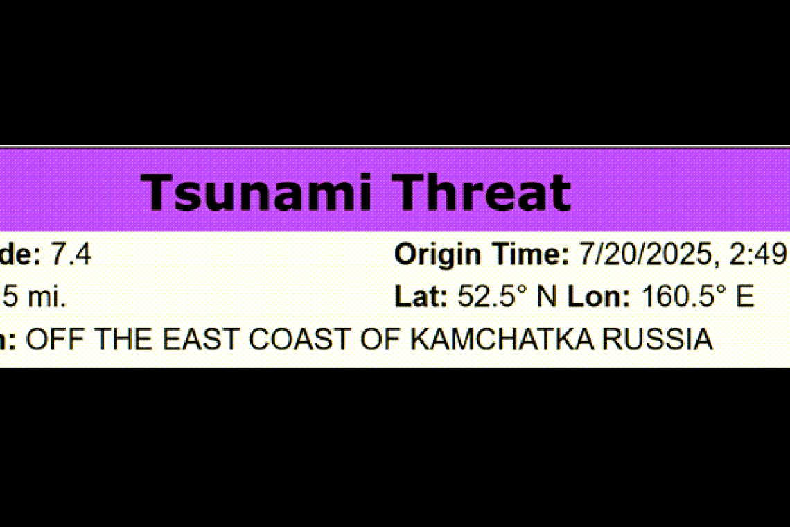 ZCZC WEPA40 PHEB 200701 TSUPAC TSUNAMI MESSAGE NUMBER 1 NWS PACIFIC TSUNAMI WARNING CENTER HONOLULU HI 0701 UTC SUN JUL 20 2025 ...PTWC TSUNAMI THREAT MESSAGE... **** NOTICE **** NOTICE **** NOTICE **** NOTICE **** NOTICE ***** THIS MESSAGE IS ISSUED FOR INFORMATION ONLY IN SUPPORT OF THE UNESCO/IOC PACIFIC TSUNAMI WARNING AND MITIGATION SYSTEM AND IS MEANT FOR NATIONAL AUTHORITIES IN EACH COUNTRY OF THAT SYSTEM. NATIONAL AUTHORITIES WILL DETERMINE THE APPROPRIATE LEVEL OF ALERT FOR EACH COUNTRY AND MAY ISSUE ADDITIONAL OR MORE REFINED INFORMATION. **** NOTICE **** NOTICE **** NOTICE **** NOTICE **** NOTICE ***** PRELIMINARY EARTHQUAKE PARAMETERS --------------------------------- * MAGNITUDE 7.5 * ORIGIN TIME 0649 UTC JUL 20 2025 * COORDINATES 52.5 NORTH 160.7 EAST * DEPTH 77 KM / 48 MILES * LOCATION OFF THE EAST COAST OF KAMCHATKA RUSSIA EVALUATION ---------- * AN EARTHQUAKE WITH A PRELIMINARY MAGNITUDE OF 7.5 OCCURRED OFF THE EAST COAST OF KAMCHATKA, RUSSIA AT 0649 UTC ON SUNDAY JULY 20 2025. * BASED ON THE PRELIMINARY EARTHQUAKE PARAMETERS... HAZARDOUS TSUNAMI WAVES ARE POSSIBLE FOR COASTS LOCATED WITHIN 300 KM OF THE EARTHQUAKE EPICENTER. TSUNAMI THREAT FORECAST ----------------------- * HAZARDOUS TSUNAMI WAVES FROM THIS EARTHQUAKE ARE POSSIBLE WITHIN 300 KM OF THE EPICENTER ALONG THE COASTS OF RUSSIA. RECOMMENDED ACTIONS ------------------- * GOVERNMENT AGENCIES RESPONSIBLE FOR THREATENED COASTAL AREAS SHOULD TAKE ACTION TO INFORM AND INSTRUCT ANY COASTAL POPULATIONS AT RISK IN ACCORDANCE WITH THEIR OWN EVALUATION... PROCEDURES AND THE LEVEL OF THREAT. * PERSONS LOCATED IN THREATENED COASTAL AREAS SHOULD STAY ALERT FOR INFORMATION AND FOLLOW INSTRUCTIONS FROM NATIONAL AND LOCAL AUTHORITIES. ESTIMATED TIMES OF ARRIVAL -------------------------- * ESTIMATED TIMES OF ARRIVAL -ETA- OF THE INITIAL TSUNAMI WAVE FOR PLACES WITH A POTENTIAL TSUNAMI THREAT. ACTUAL ARRIVAL TIMES MAY DIFFER AND THE INITIAL WAVE MAY NOT BE THE LARGEST. A TSUNAMI IS A SERIES OF WAVES AND THE TIME BETWEEN WAVES CAN BE FIVE MINUTES TO ONE HOUR. LOCATION REGION COORDINATES ETA(UTC) ------------------------------------------------------------ PETROPAVLOVSK RUSSIA 53.2N 159.6E 0728 07/20 POTENTIAL IMPACTS ----------------- * A TSUNAMI IS A SERIES OF WAVES. THE TIME BETWEEN WAVE CRESTS CAN VARY FROM 5 MINUTES TO AN HOUR. THE HAZARD MAY PERSIST FOR MANY HOURS OR LONGER AFTER THE INITIAL WAVE. * IMPACTS CAN VARY SIGNIFICANTLY FROM ONE SECTION OF COAST TO THE NEXT DUE TO LOCAL BATHYMETRY AND THE SHAPE AND ELEVATION OF THE SHORELINE. * IMPACTS CAN ALSO VARY DEPENDING UPON THE STATE OF THE TIDE AT THE TIME OF THE MAXIMUM TSUNAMI WAVES. * PERSONS CAUGHT IN THE WATER OF A TSUNAMI MAY DROWN... BE CRUSHED BY DEBRIS IN THE WATER... OR BE SWEPT OUT TO SEA. NEXT UPDATE AND ADDITIONAL INFORMATION -------------------------------------- * THE NEXT MESSAGE WILL BE ISSUED IN ONE HOUR... OR SOONER IF THE SITUATION WARRANTS. * AUTHORITATIVE INFORMATION ABOUT THE EARTHQUAKE FROM THE U.S. GEOLOGICAL SURVEY CAN BE FOUND ON THE INTERNET AT EARTHQUAKE.USGS.GOV. * FURTHER INFORMATION ABOUT THIS EVENT MAY BE FOUND AT WWW.TSUNAMI.GOV. * COASTAL REGIONS OF HAWAII... AMERICAN SAMOA... GUAM... AND CNMI SHOULD REFER TO PACIFIC TSUNAMI WARNING CENTER MESSAGES SPECIFICALLY FOR THOSE PLACES THAT CAN BE FOUND AT WWW.TSUNAMI.GOV. * COASTAL REGIONS OF CALIFORNIA... OREGON... WASHINGTON... BRITISH COLUMBIA AND ALASKA SHOULD ONLY REFER TO U.S. NATIONAL TSUNAMI WARNING CENTER MESSAGES THAT CAN BE FOUND AT WWW.TSUNAMI.GOV. $$ NNNN